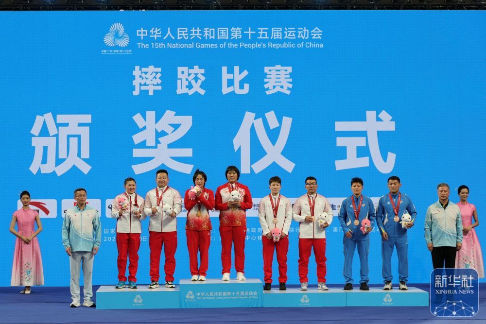 11月10日,第十五届全运会摔跤女子62公斤级自由泳决赛在清远举行。最终,吉林队选手张琪战胜内蒙古队选手鲍玲玲,夺得冠军。 ↑ 冠军吉林队张琪(左五)、亚军内蒙古队鲍玲玲(左三)、季军内蒙古队选手丽丽(右六)、季军辽宁队罗小娟(右四)与教练员在颁奖典礼上合影。 ↑ 吉林队球员张琪(右)赛后庆祝胜利。 ↑ 吉林队球员张琪(右)与内蒙古队球员鲍玲玲在比赛中。 ↑ 吉林队球员张琪(左)与内蒙古队球员鲍玲玲在比赛中。 ↑ 吉林队球员张琪(左)与内蒙古队球员包玲玲在比赛中。新华社记者 李然 摄